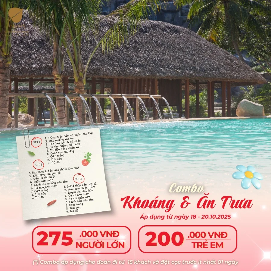 Combo Tắm khoáng & Ăn trưa: Chỉ 275.000 Đ/người lớn và 200.000 Đ/trẻ em.