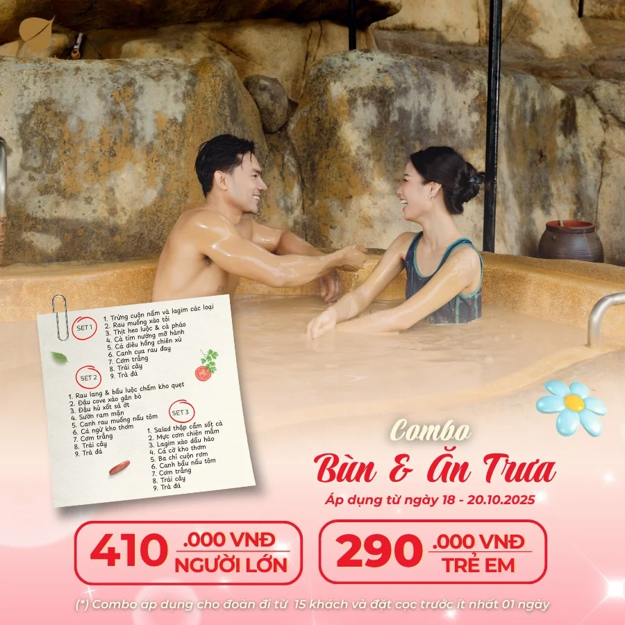 Combo Tắm bùn & Ăn trưa: Chỉ 410.000 Đ/người lớn và 290.000 Đ/trẻ em.