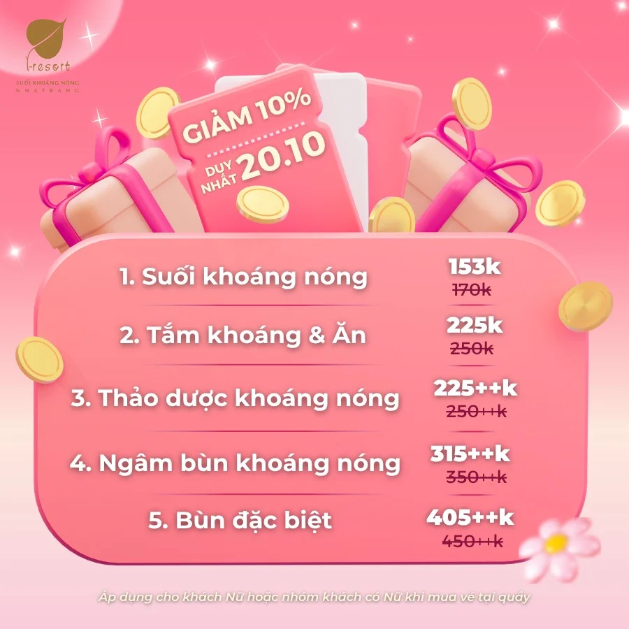 GIẢM 10% cho khách Nữ hoặc nhóm khách có Nữ khi mua vé tại quầy trong ngày 20.10.2025 đối với các dịch vụ: tắm khoáng, tắm khoáng & ăn, tắm bùn, tắm khoáng thảo dược và bùn đặc biệt.